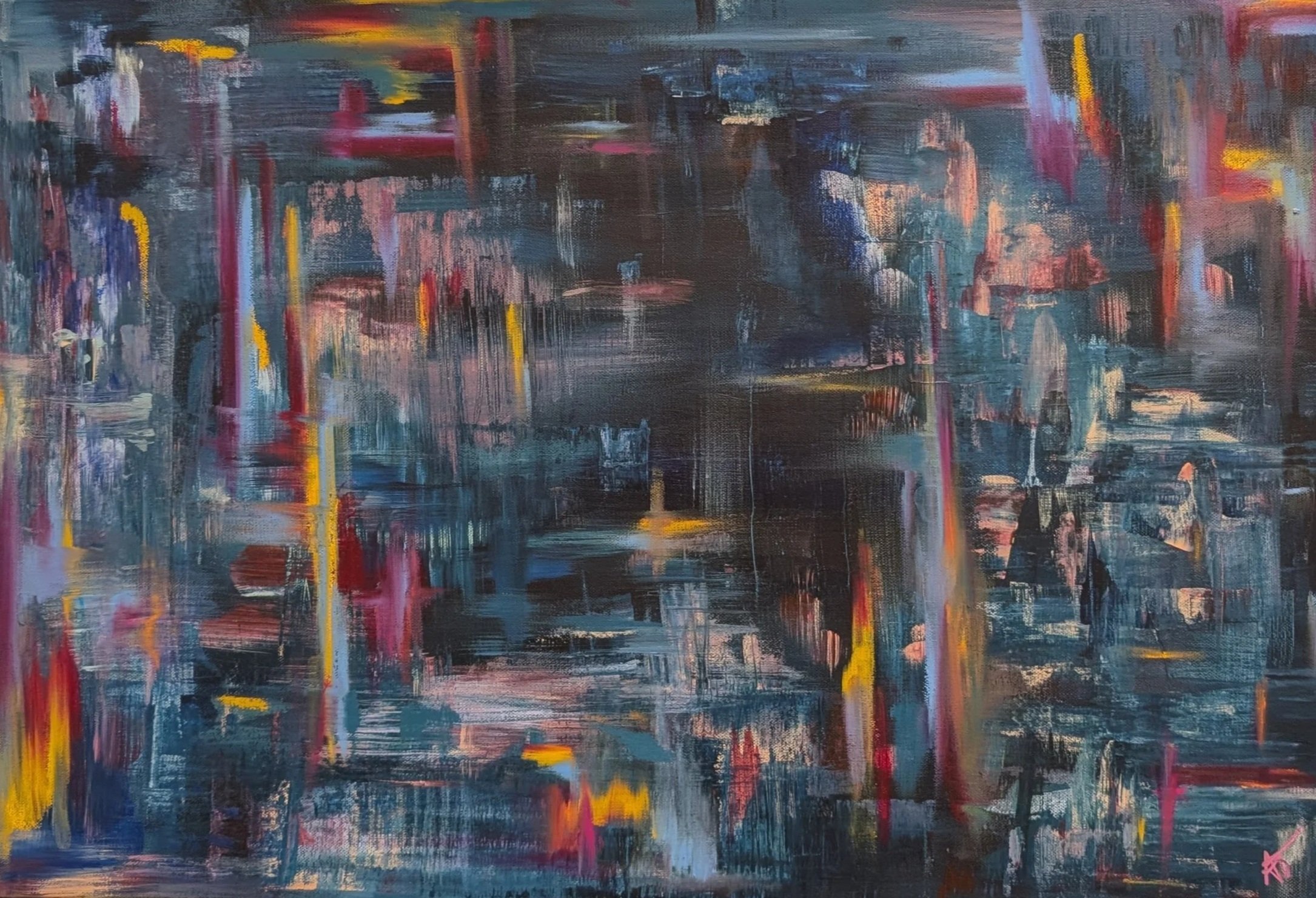 Rush Hour captures motion in full abstraction — a storm of crimson, blue, and gold streaks that suggest movement, urgency, and energy. This piece doesn’t sit still; it pulses with the force of a busy moment paused mid-frame.